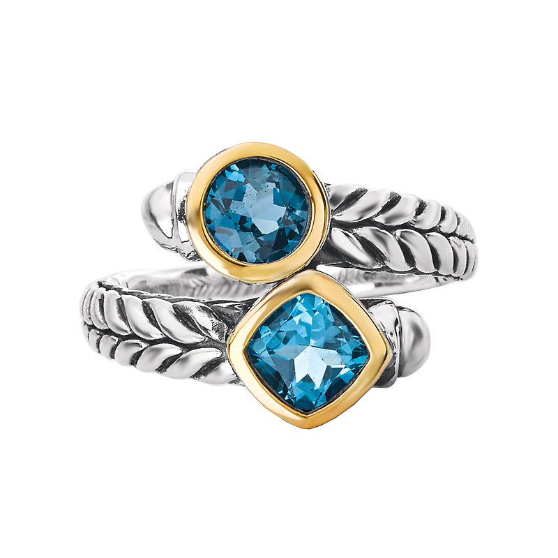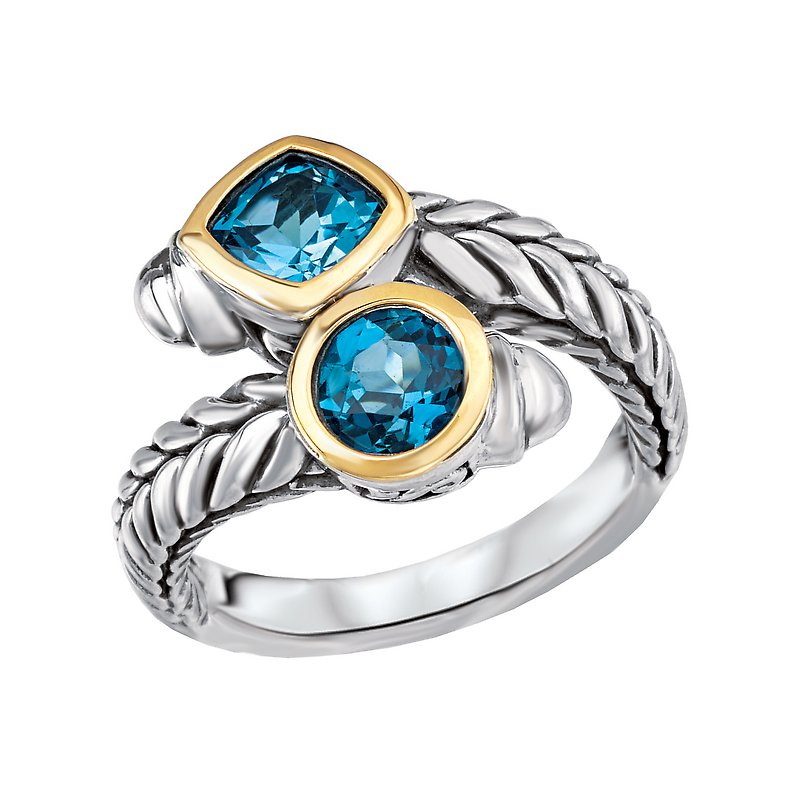 Two beautiful faceted blue topaz gemstones are showcased on this silver ring accented with 18k yellow gold trim.