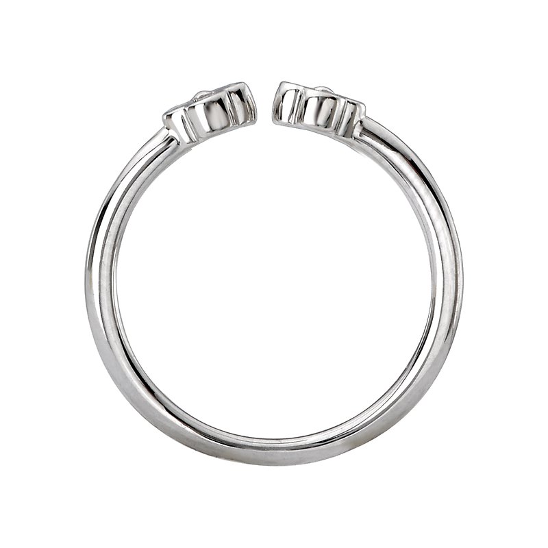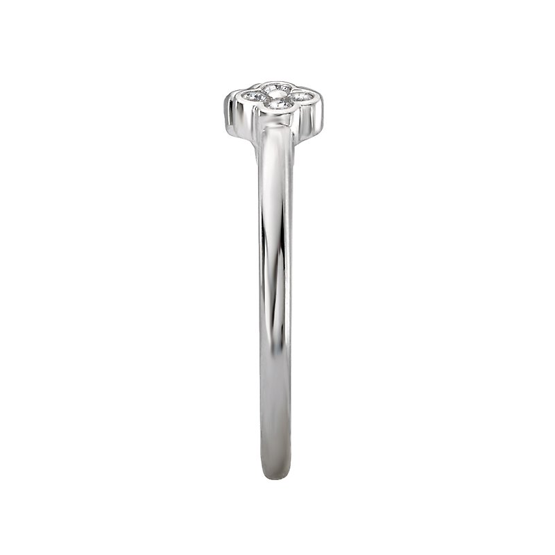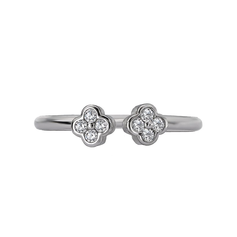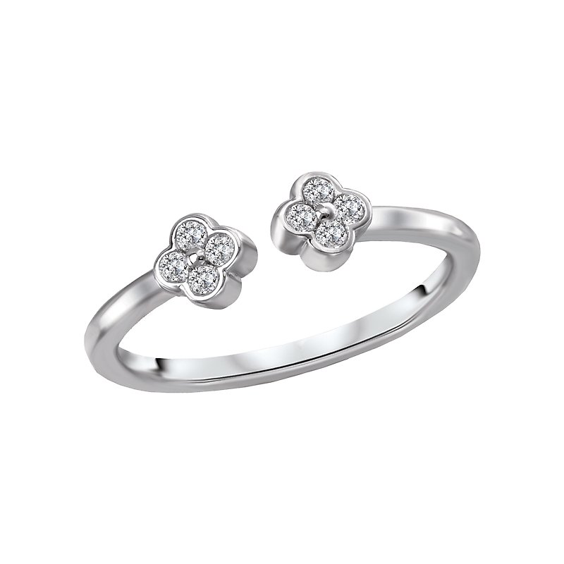 Open ring is crafted in high polished silver that showcases four leaf clovers accented with round sparkling diamonds. (D 1/8 carat total weight)