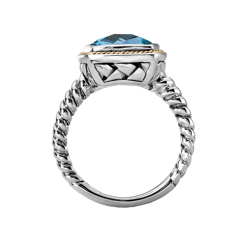 Sparkling fashion silver ring features a 12x10mm blue topaz center wrapped with a twisted rope design created in 18k yellow gold.