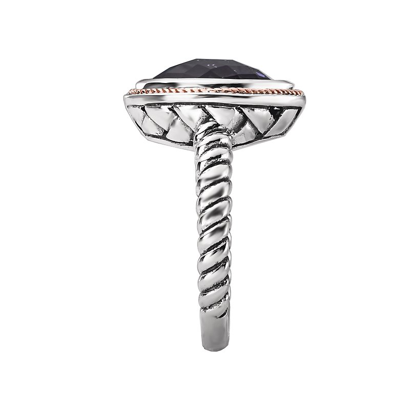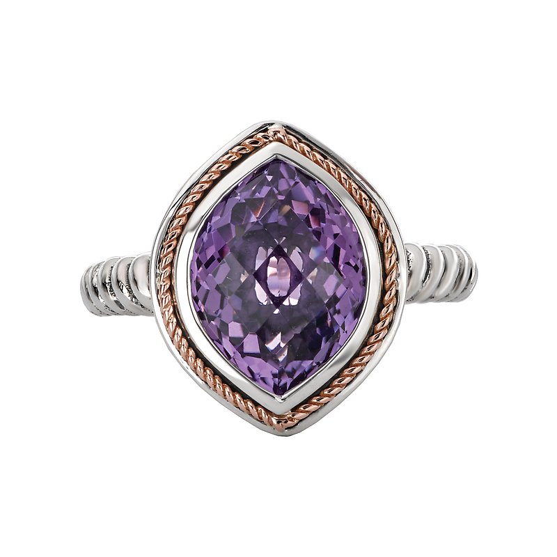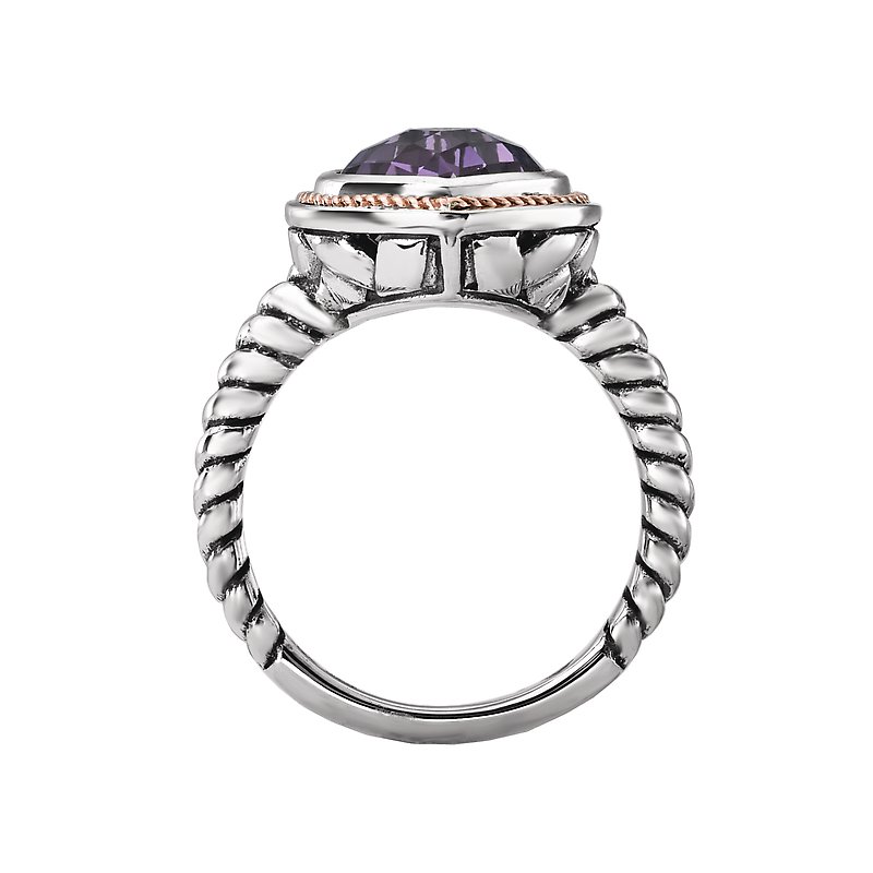 This ring features a halo created with twisting 18k rose gold wrapping around the 13x10mm amethyst center set in high polished silver.