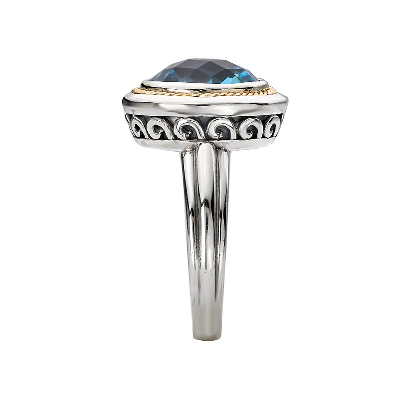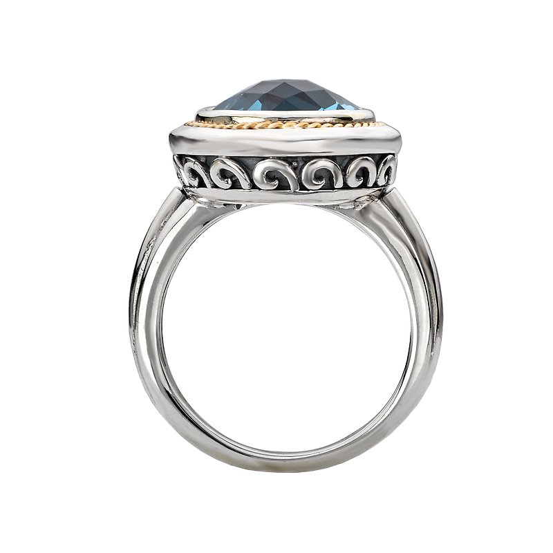 A halo created with 18k yellow gold wraps around the faceted 11mm blue topaz center of this fashion ring that is crafted in high polished sterling silver.