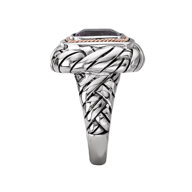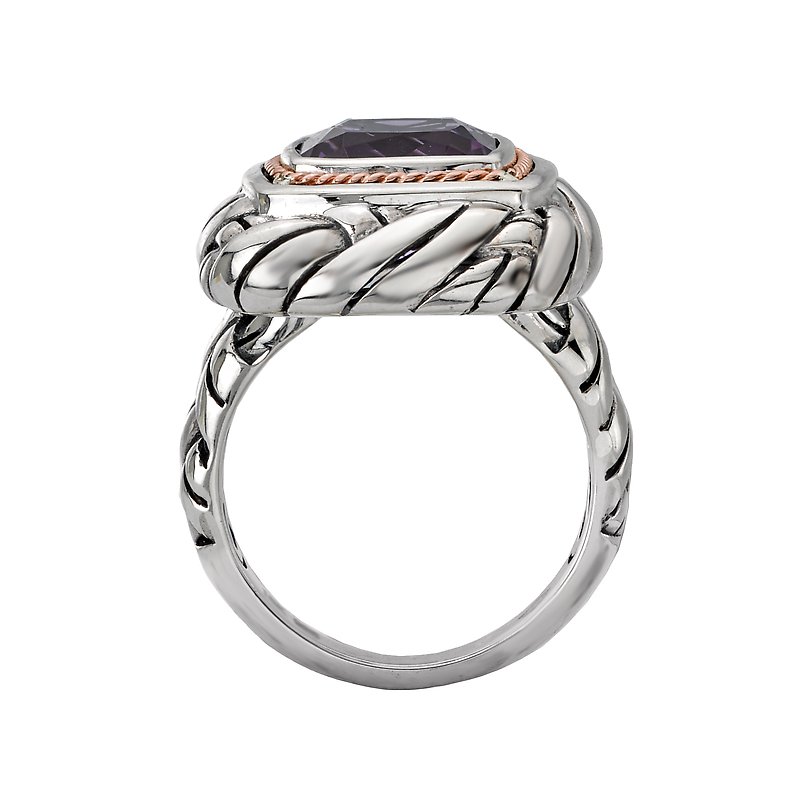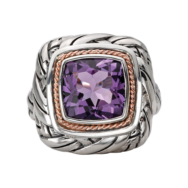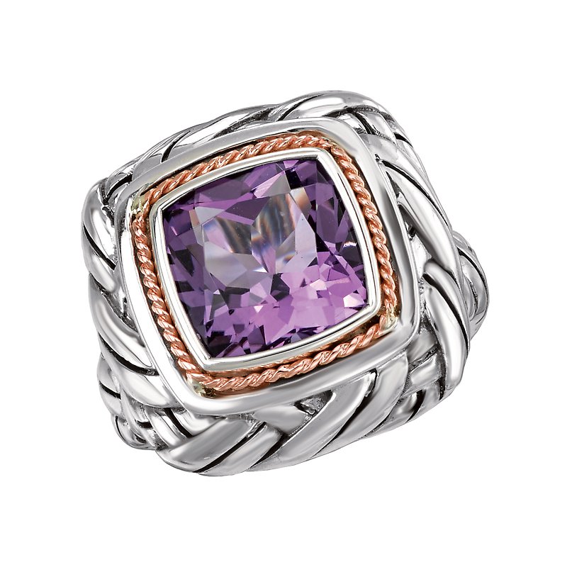 Cushion cut 10mm amethyst gemstone is the center of attention on this spectacular ladies fashion ring crafted in high polished sterling silver. Accents of 14k rose gold complete the ensemble.