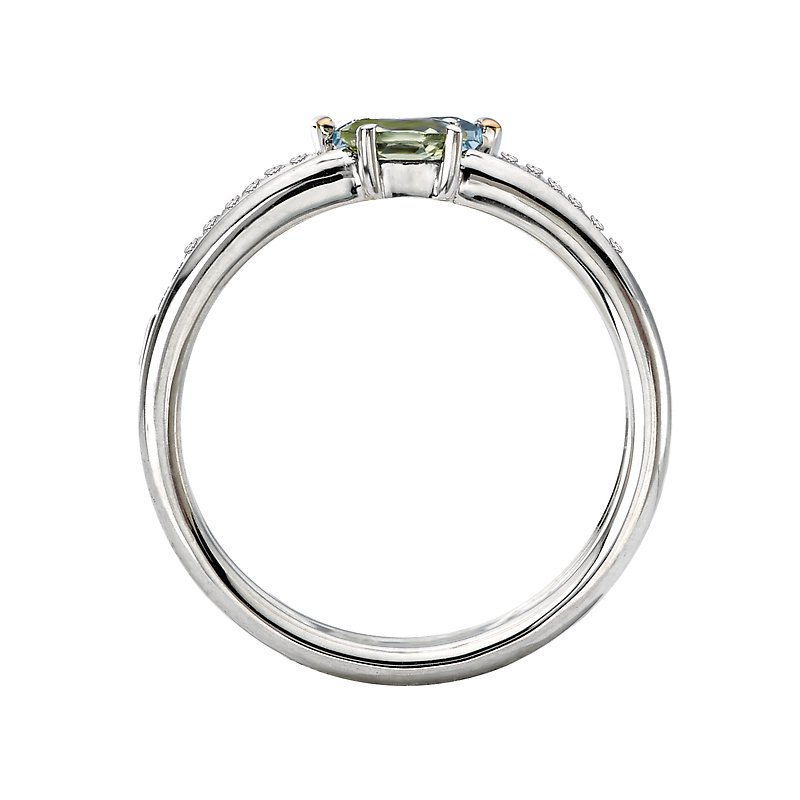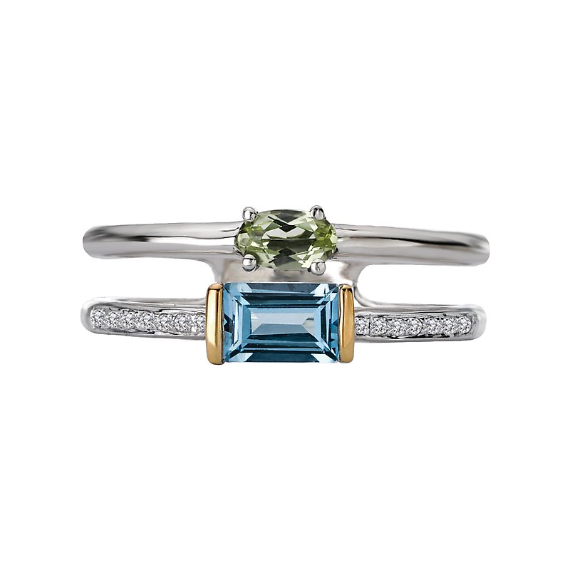This polished ring features 4x6mm emerald cut blue topaz, a 3x5mm oval cut peridot and .06 ct diamonds along the split shaft.