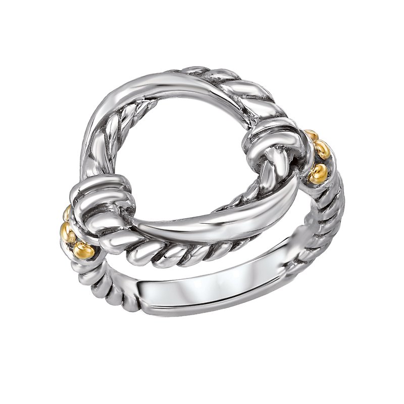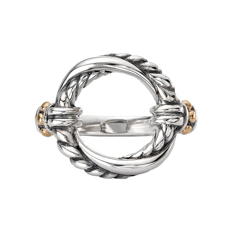This silver rope style ring with a circle shape is accented with 18k yellow gold and secured with a hook clasp closure.