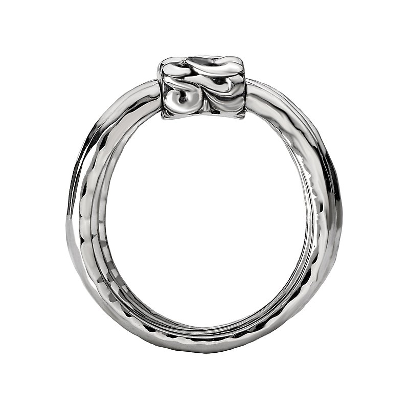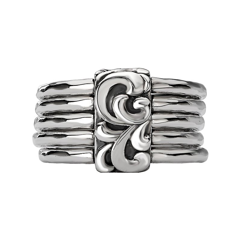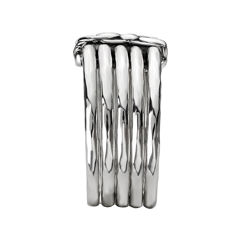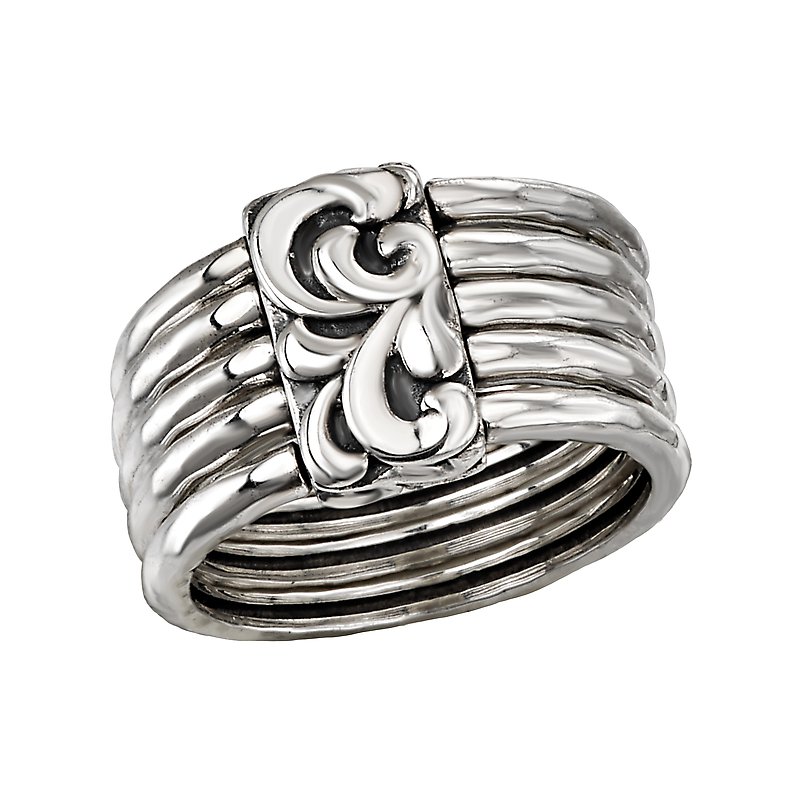 This ring is a silver ladies fashion ring with five linked bands and an beautiful designed front.