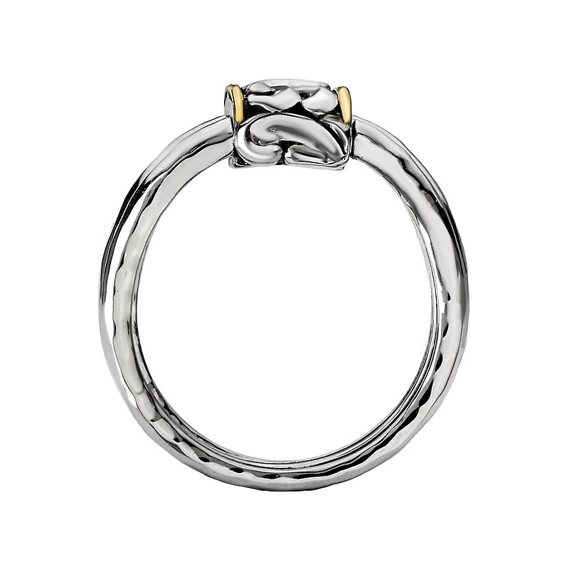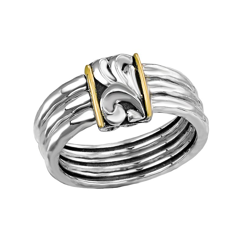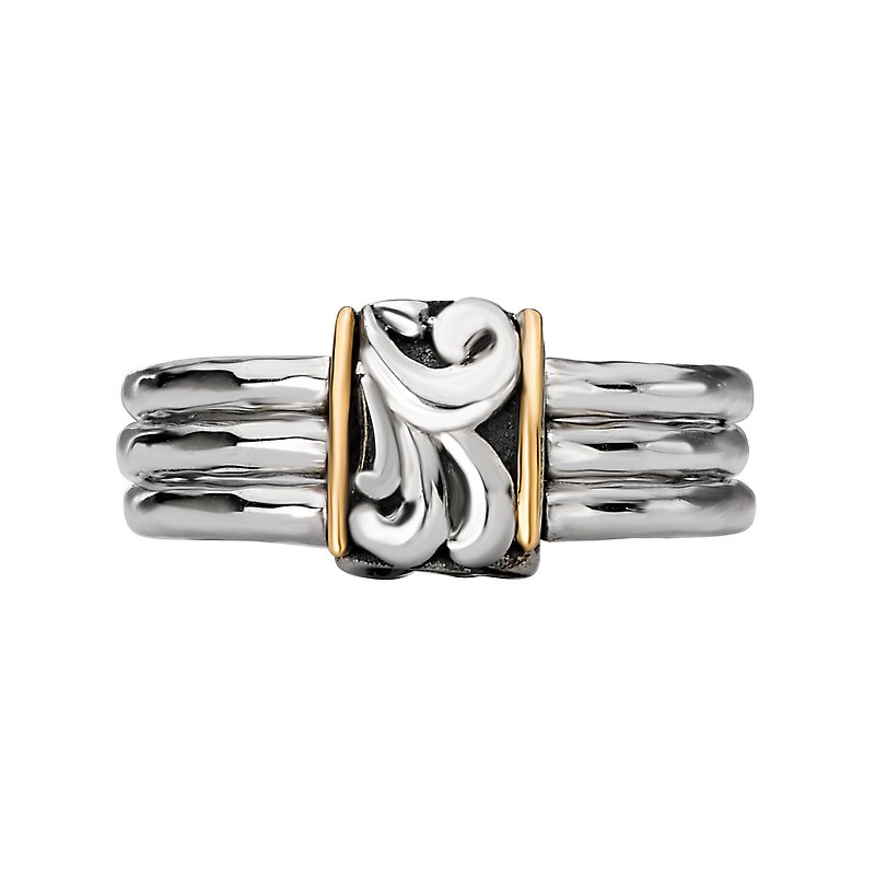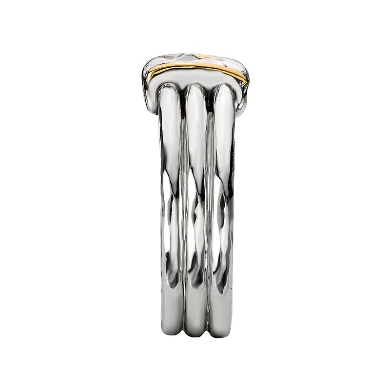 This silver ladies fashion ring has three linked bands with a silver and 18kt yellow gold design on the front.