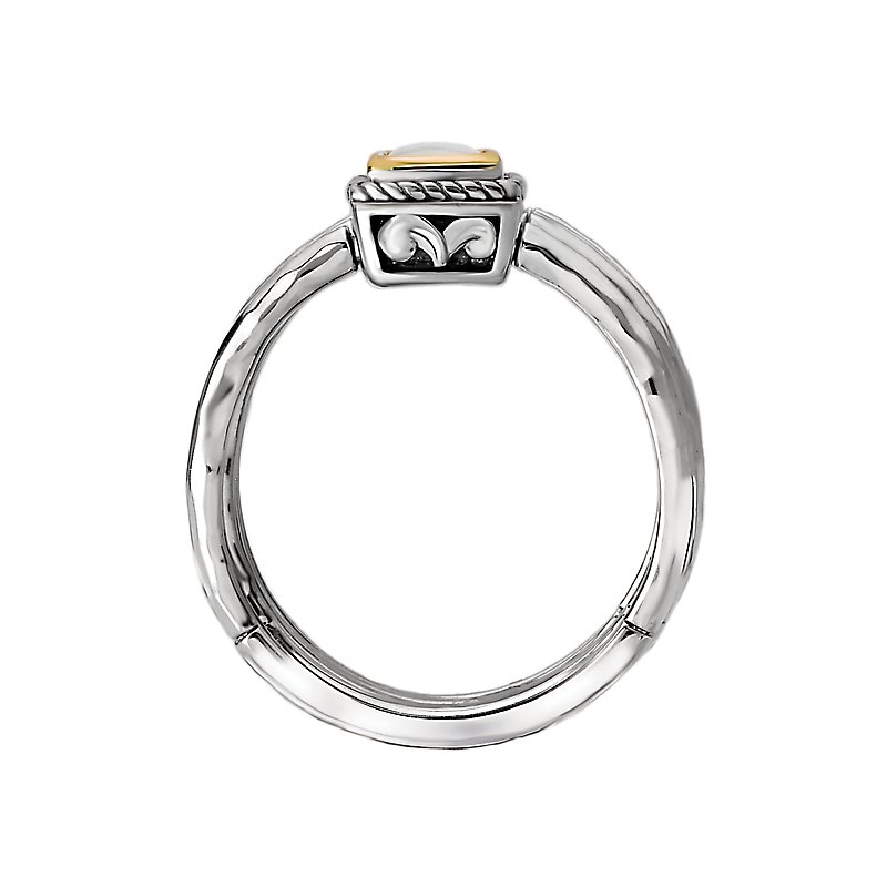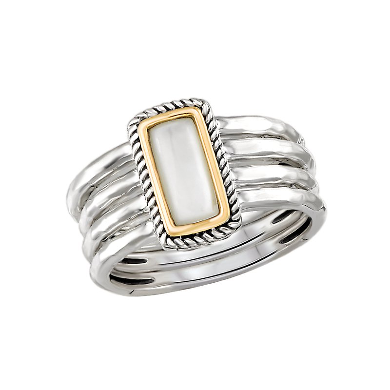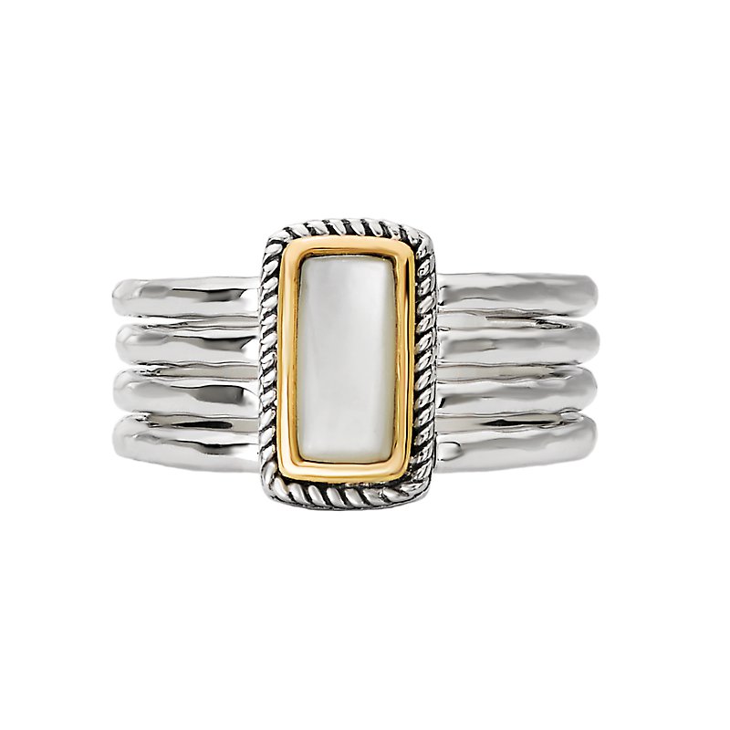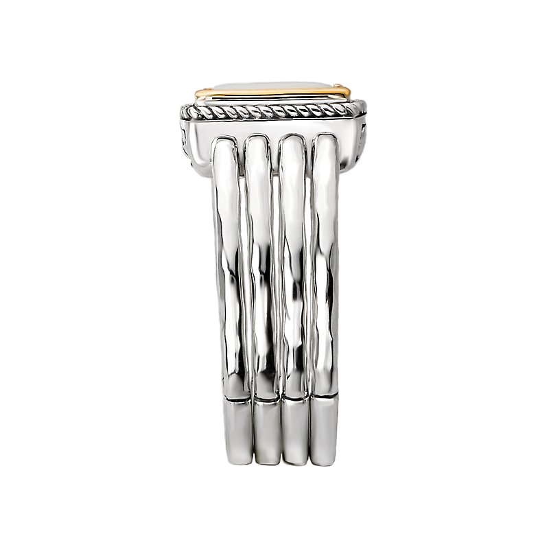 This ladies fashion ring has a band made of four rings of hammered sterling silver and a center white mother of pearl stone with a halo of 18kt yellow gold and a silver rope design.