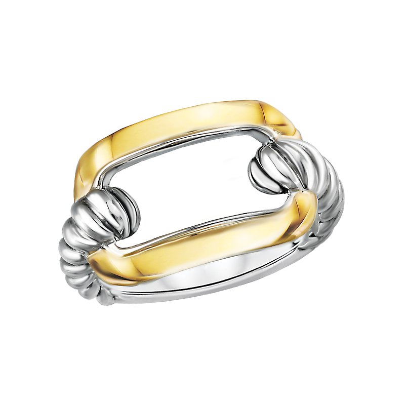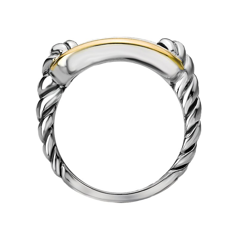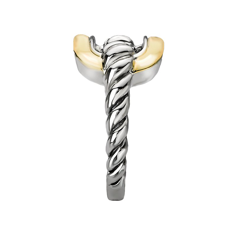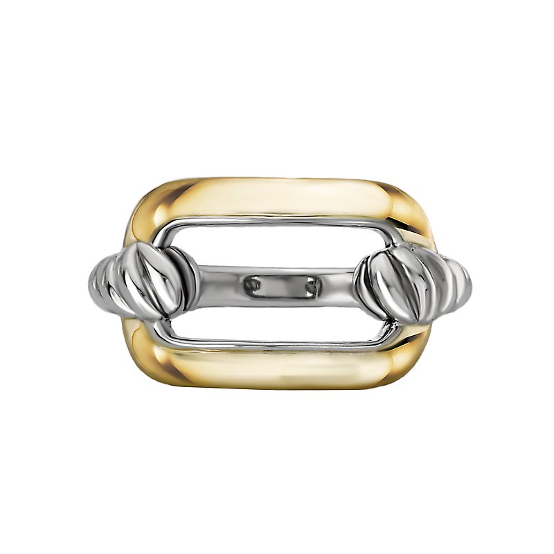 This is two-tone ring with an 18kt buckle design secured with a sterling silver rope design band.