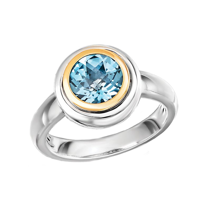 This silver ring has an 18kt yellow gold halo around a beautiful blue topaz.