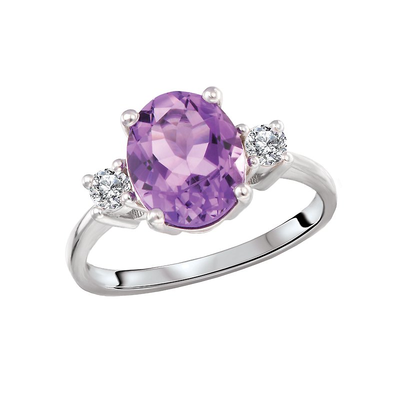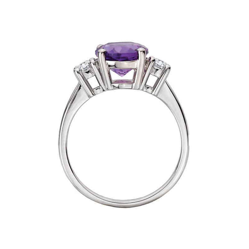 Sterling silver fashion ring with two round white topaz on either side of a center setting that holds a 10x8 oval cut amethyst.