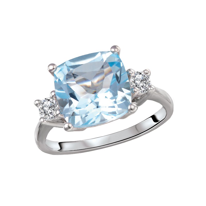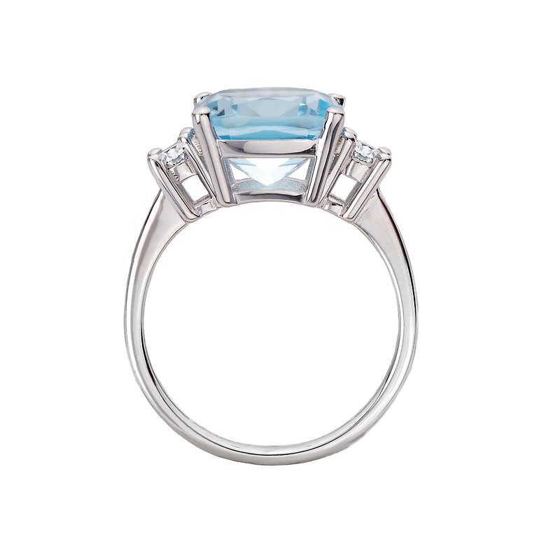 Sterling silver ladies fashion ring featuring a 10x10 cushion shaped sky blue topaz with 2 white topaz on either side. (Sky BT 2.5 carat total weight, Wht Topaz 2@.14 carat total weight)