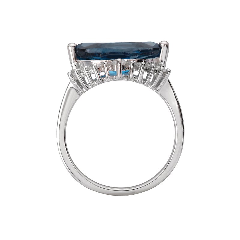 A marquise shape london blue topaz ring in sterling silver is crowned with white topaz. Size 7