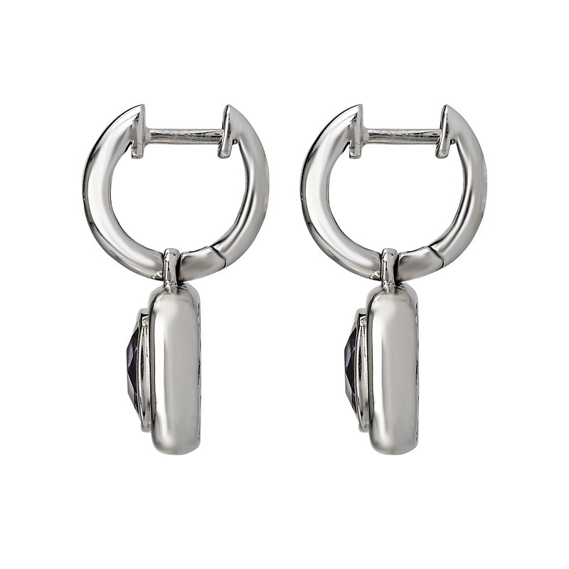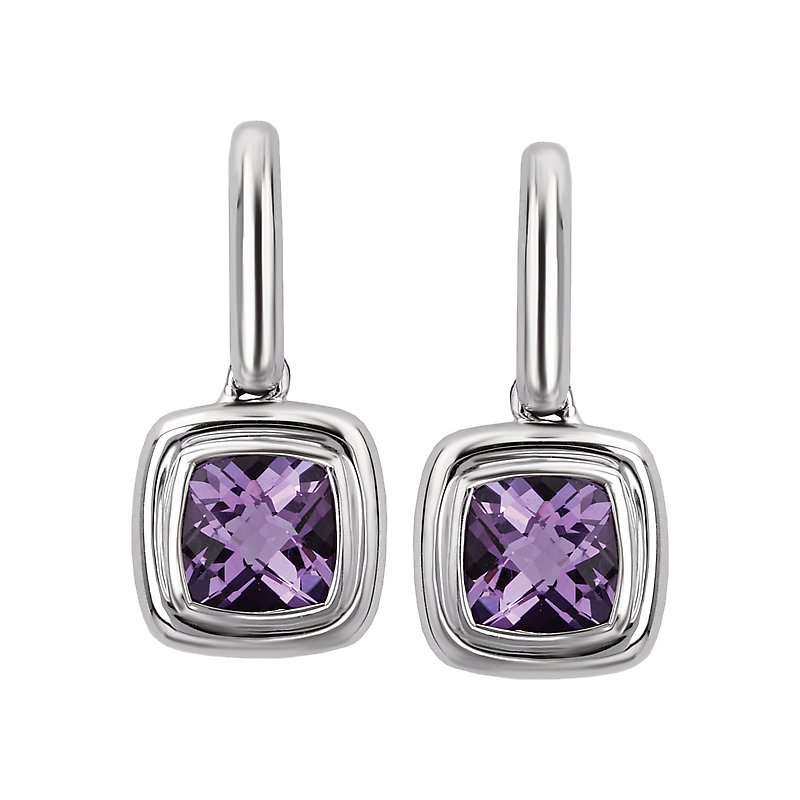 Beautiful cushion cut amethyst huggie earrings hang from high polished hoops. (AM 7mm)
