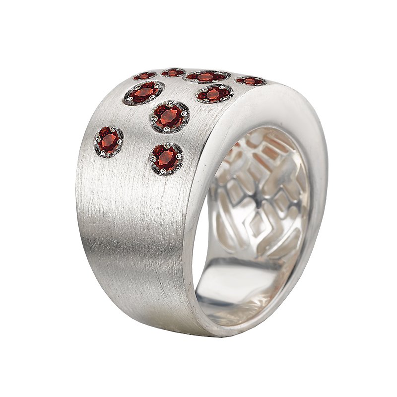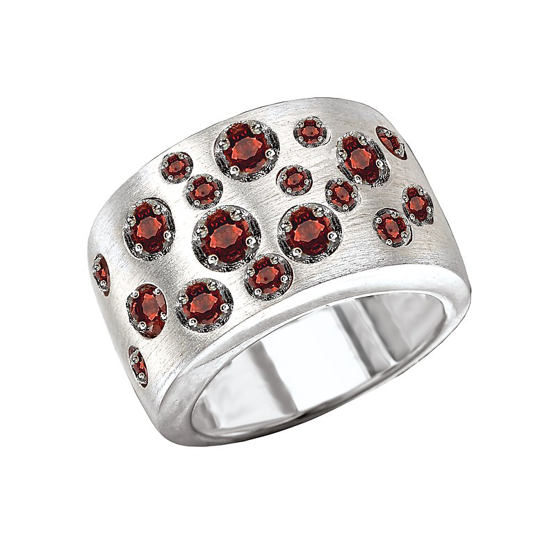 Satin Finish Ring With Round Garnet Stones In Sterling Silver.