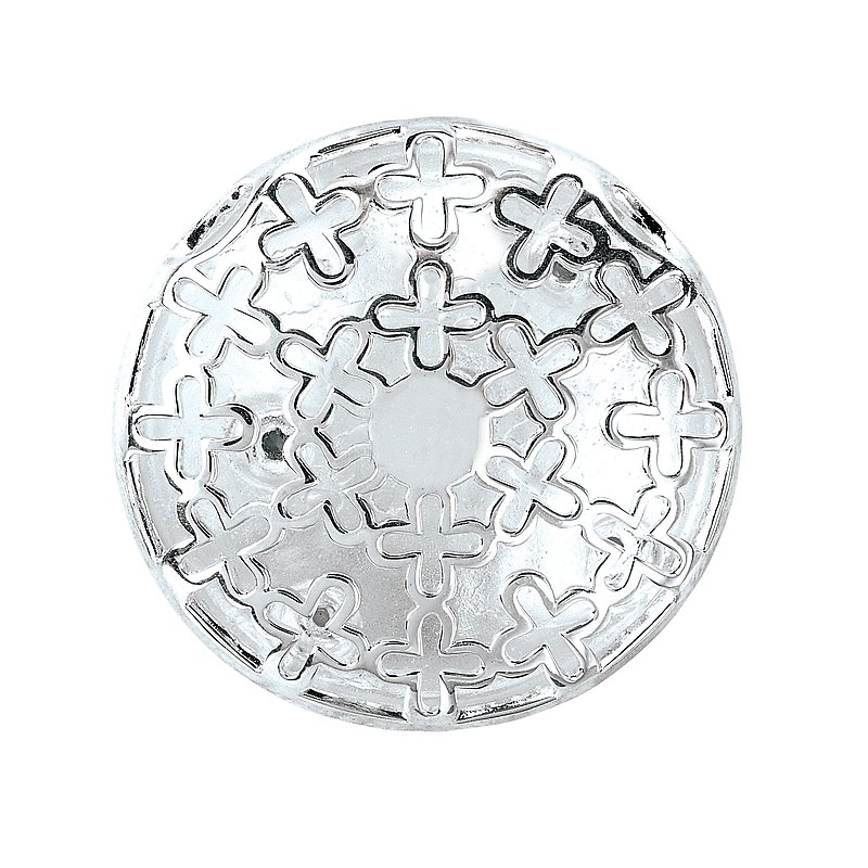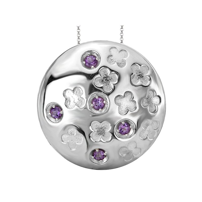 This is a beautiful round domed high polished silver pendant with stamped flower designs and round amethyst gems.