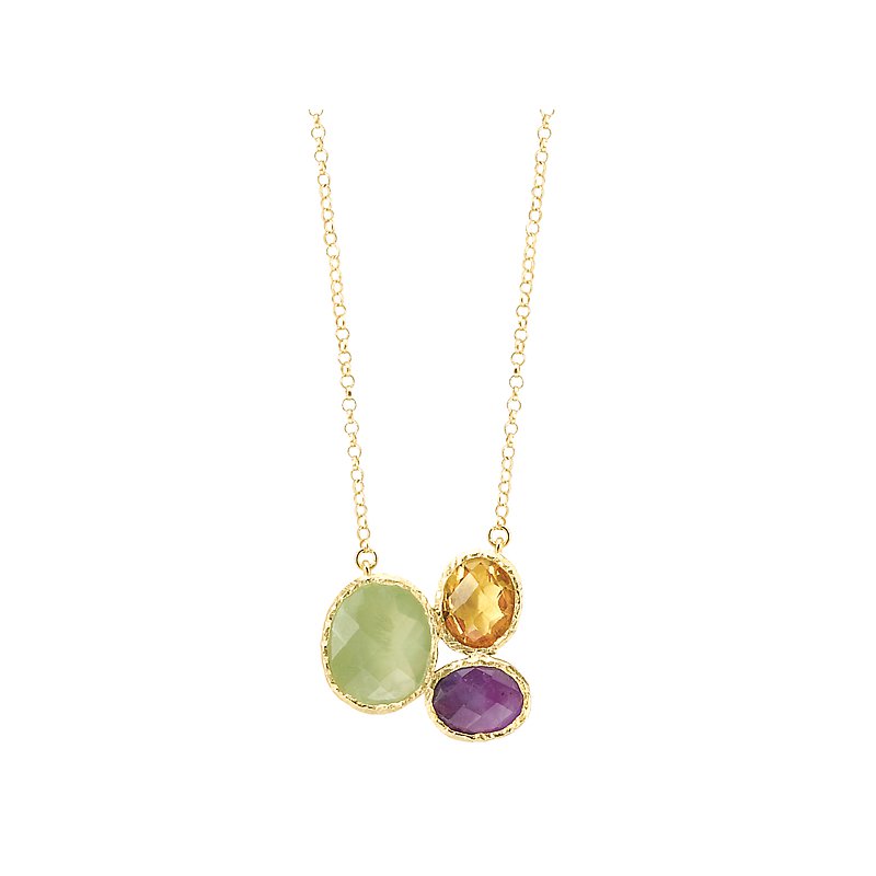 Gorgeous necklace features sparkling oval shaped Citrine, Amethyst and Prehnite gemstones swaying from an 18 inch chain crafted in high polished 18k yellow gold plated silver.