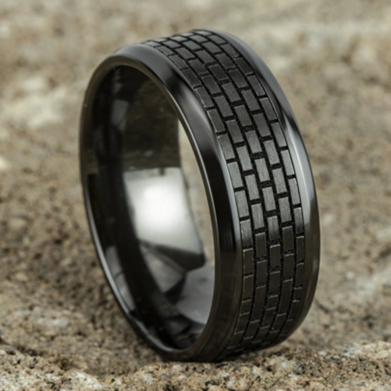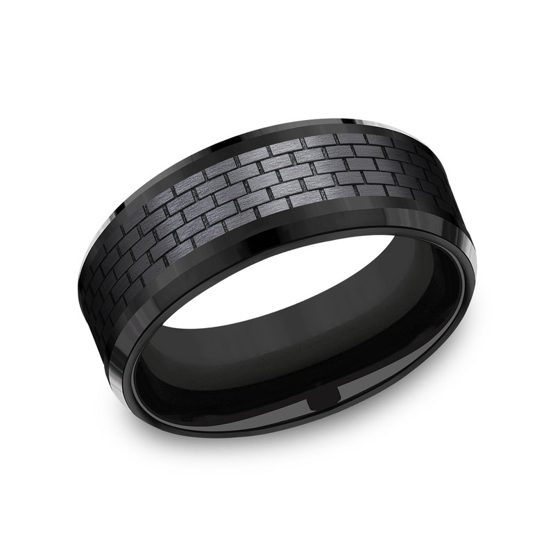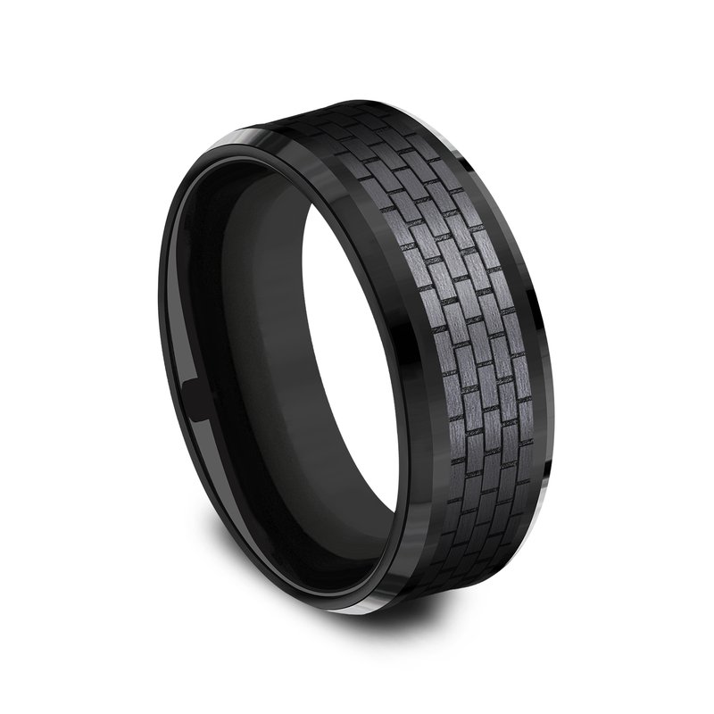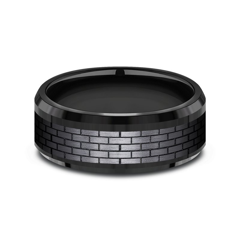 8mm, Comfort fit Black Titanium Brick wall patterned center, polished bevel edges
