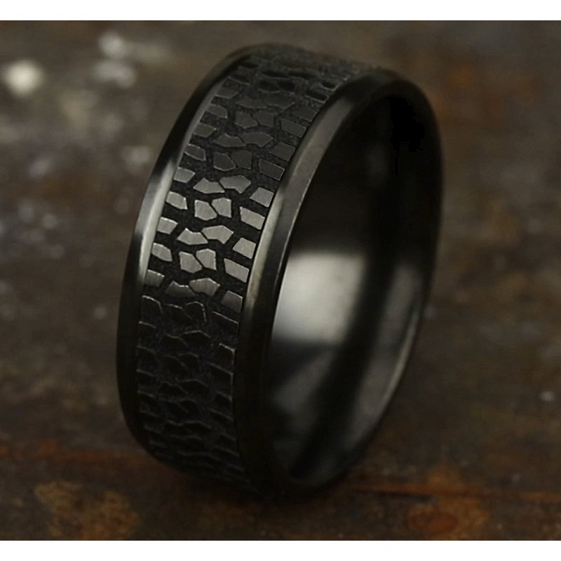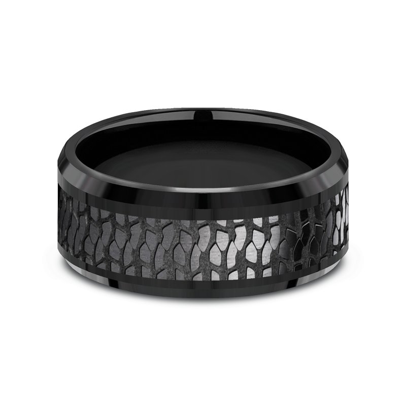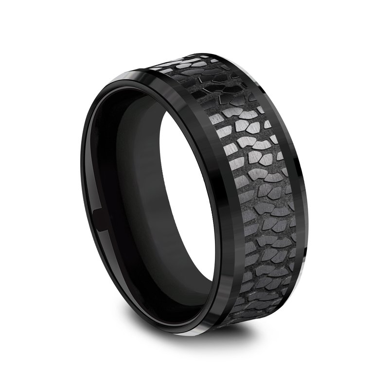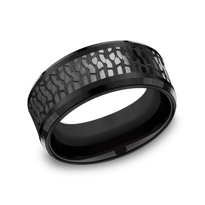 9mm, Comfort fit Black Titanium Tire tread patterned center, polished bevel edges