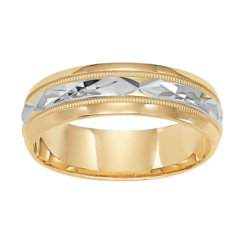 Uniquely styled this two-tone gold Comfort Fit wedding band features a bright polished cut design with milgrain and flat beveled edge
