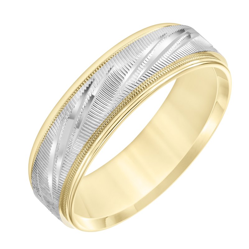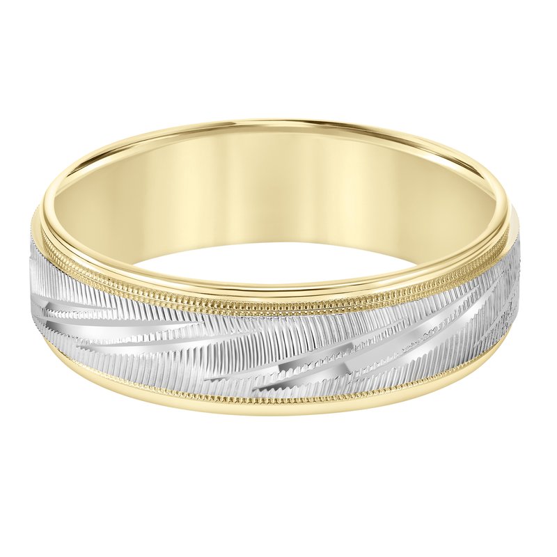 Comfort fit, two-tone engraved wedding band with cut design and bright, round edges.