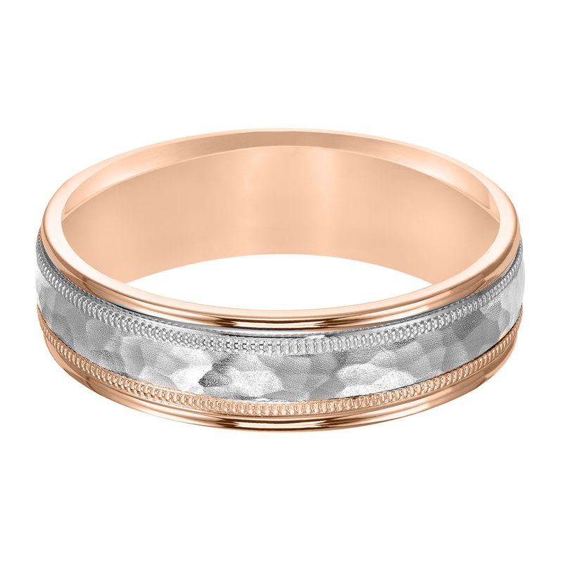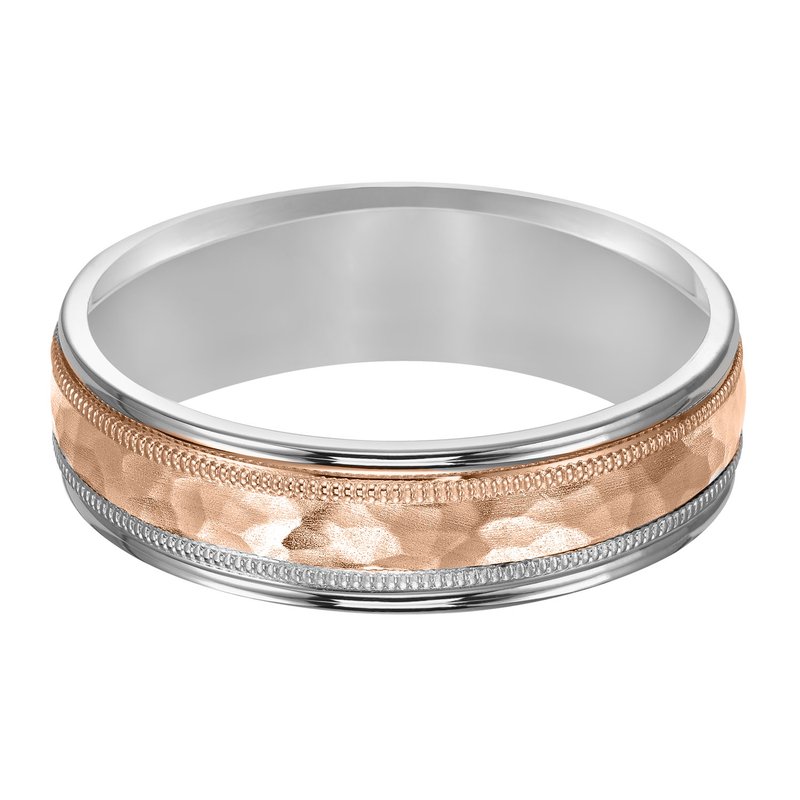Comfort fit two tone wedding band with brushed hammered finish and milgrain Please note hand hammered styles will have slight variations due to the nature of the manufacturing process