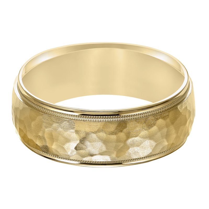 This low domed Comfort Fit yellow gold wedding band features a brushed hammered finish with milgrain and round edges for a luxurious look Please note hand hammered styles will have slight variations due to the nature of the manufacturing process