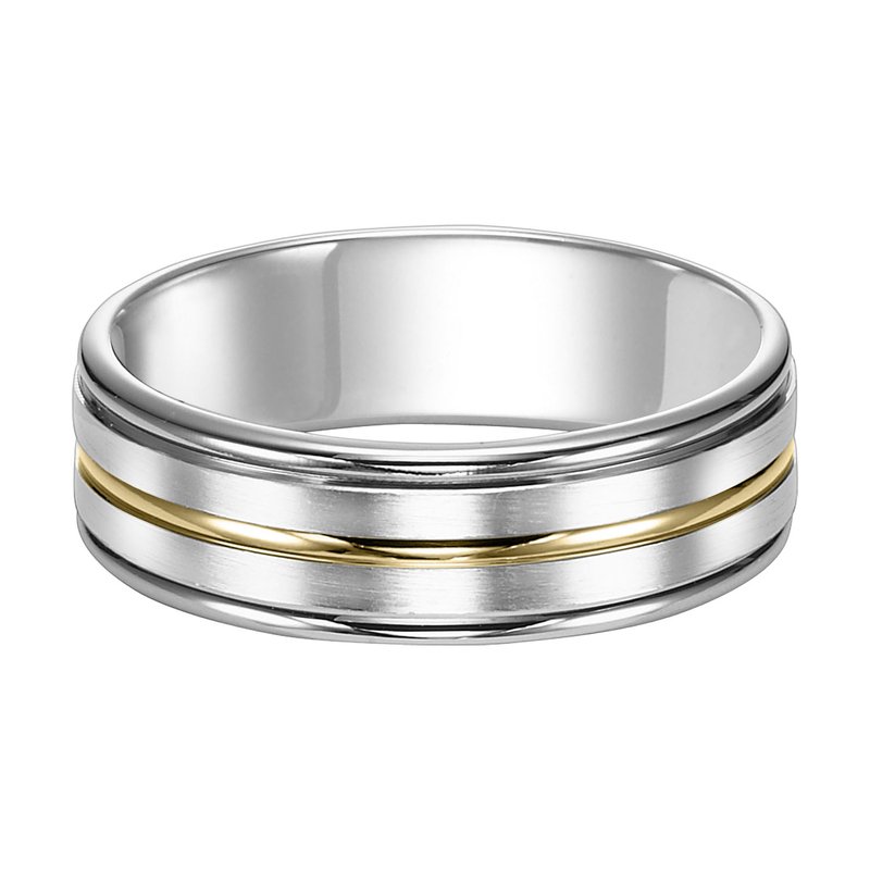 Sleek lines inspired the design of this two-tone gold, Comfort Fit wedding band enhanced with a brushed finish and round edges to complete the look