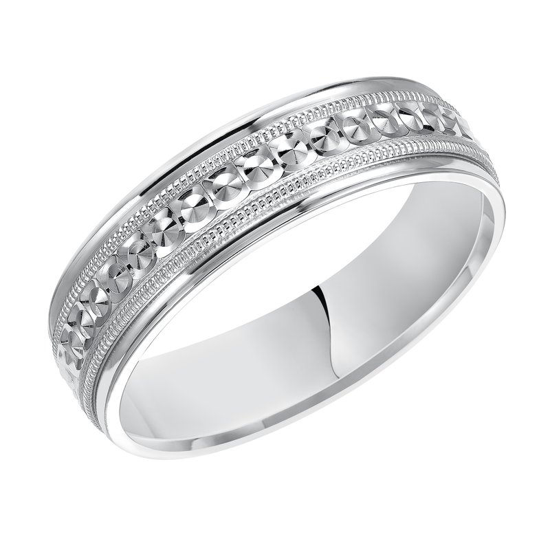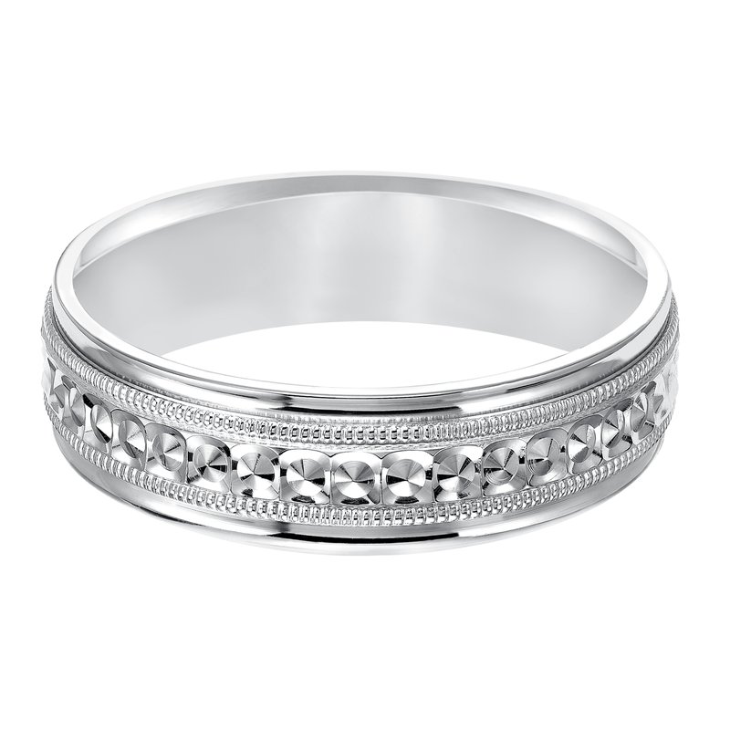 This low-dome styled, Comfort Fit wedding band features an eye-catching design with a bright finish, milgrain and round edges