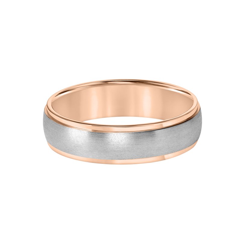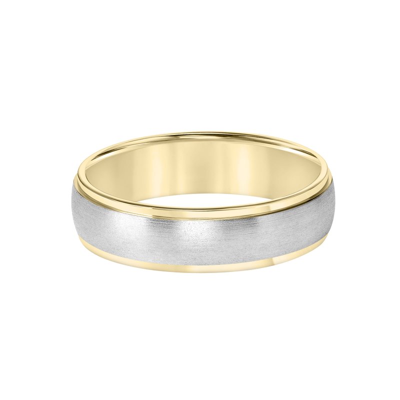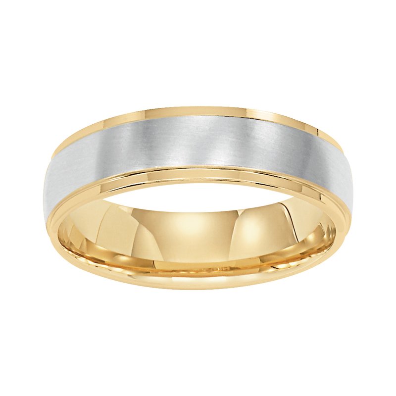 This low-dome styled, two-tone gold, Comfort Fit wedding band features a brushed finish and flat edges