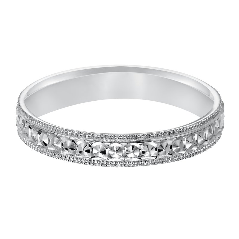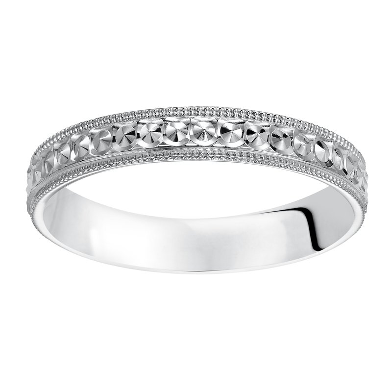 This low-dome styled, Comfort Fit wedding band features an intricate design with a bright finish and milgrain edge for a unique look