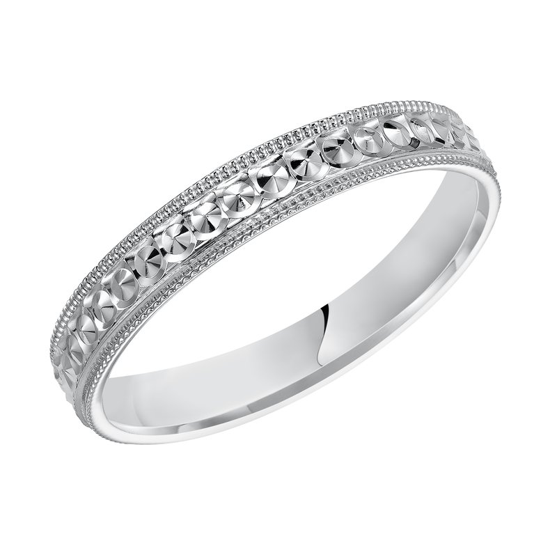This low-dome styled, Comfort Fit wedding band features an intricate design with a bright finish and milgrain edge for a unique look