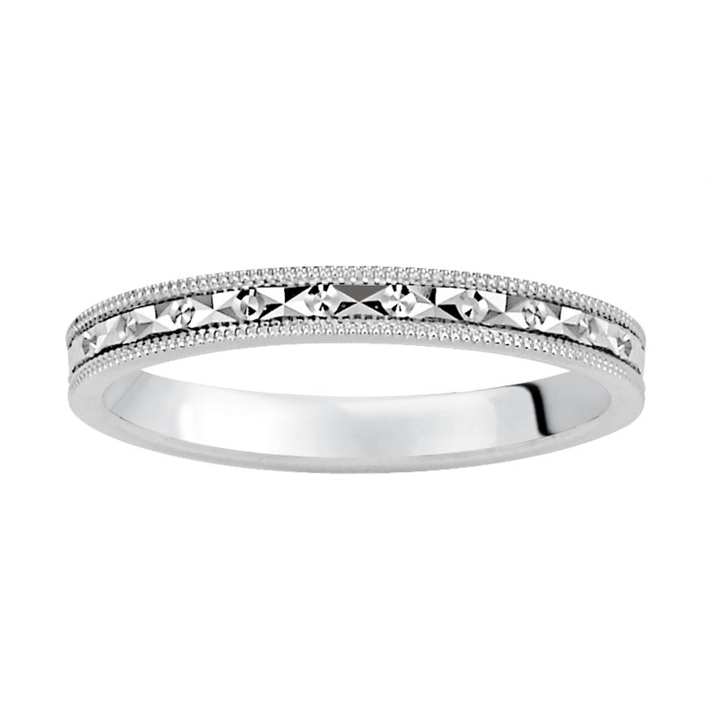 Featuring a bright finished, Swiss cut design and milgrain edge, this Comfort Fit wedding band is truly eye-catching