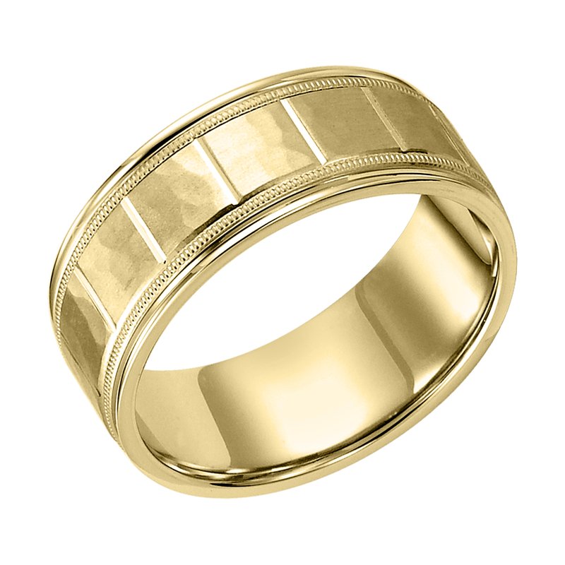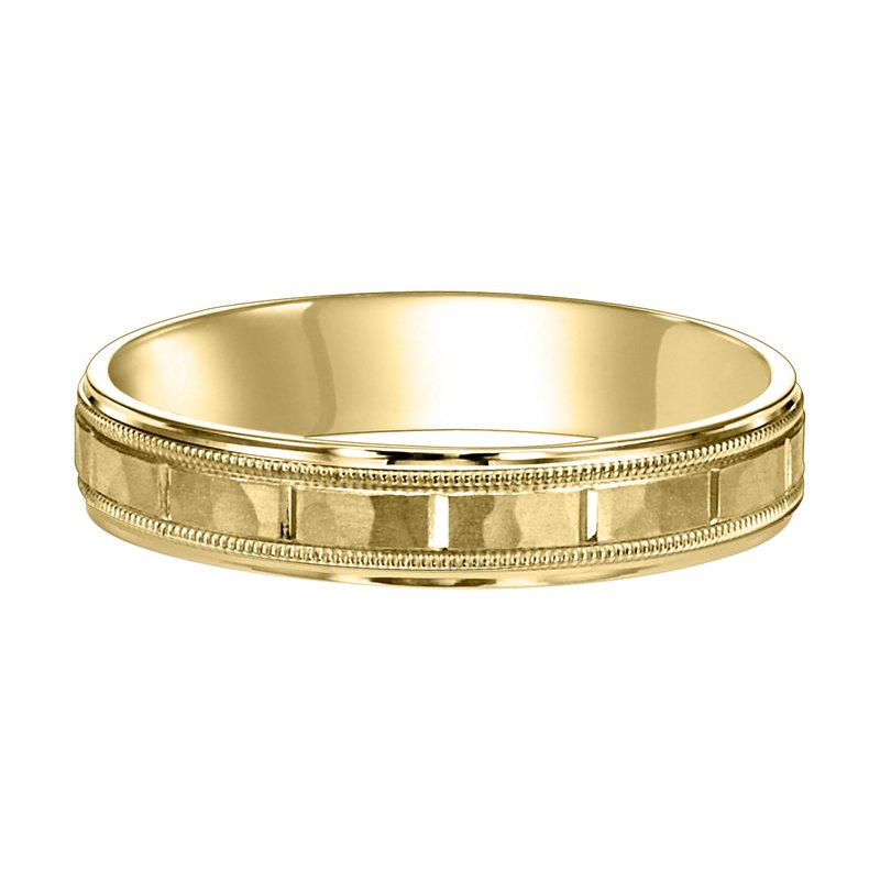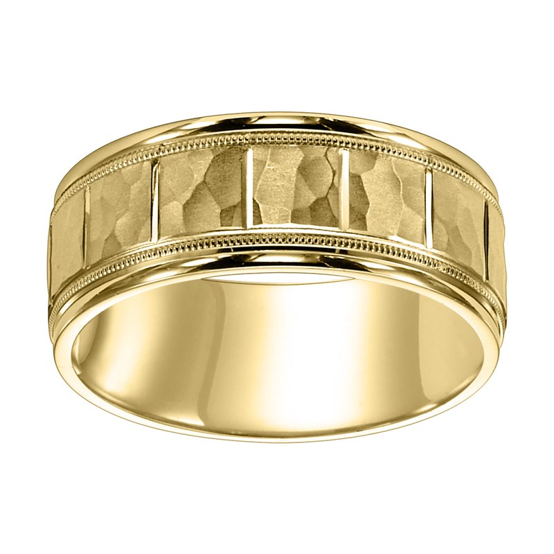 This Comfort Fit wedding band features a satin hammer finish with vertical cuts and milgrain for a modern fusion of traditional details Please note hand hammered styles will have slight variations due to the nature of the manufacturing process