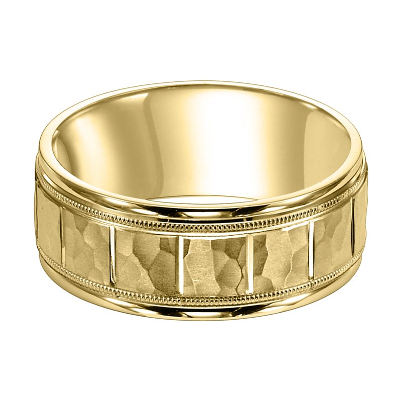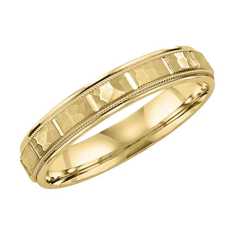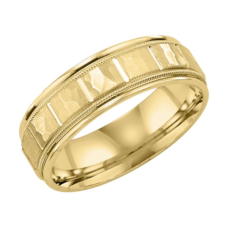This Comfort Fit wedding band features a satin hammer finish with vertical cuts and milgrain for a modern fusion of traditional details Please note hand hammered styles will have slight variations due to the nature of the manufacturing process
