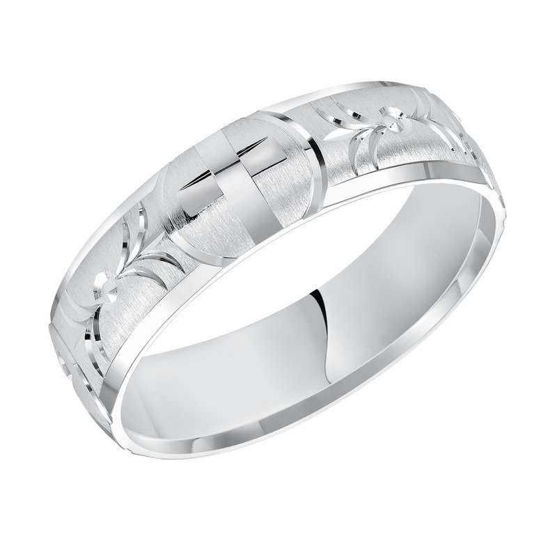 Featuring a Swiss cut and cross design with satin finish, this low-domed style, Comfort Fit wedding band is unique yet timeless