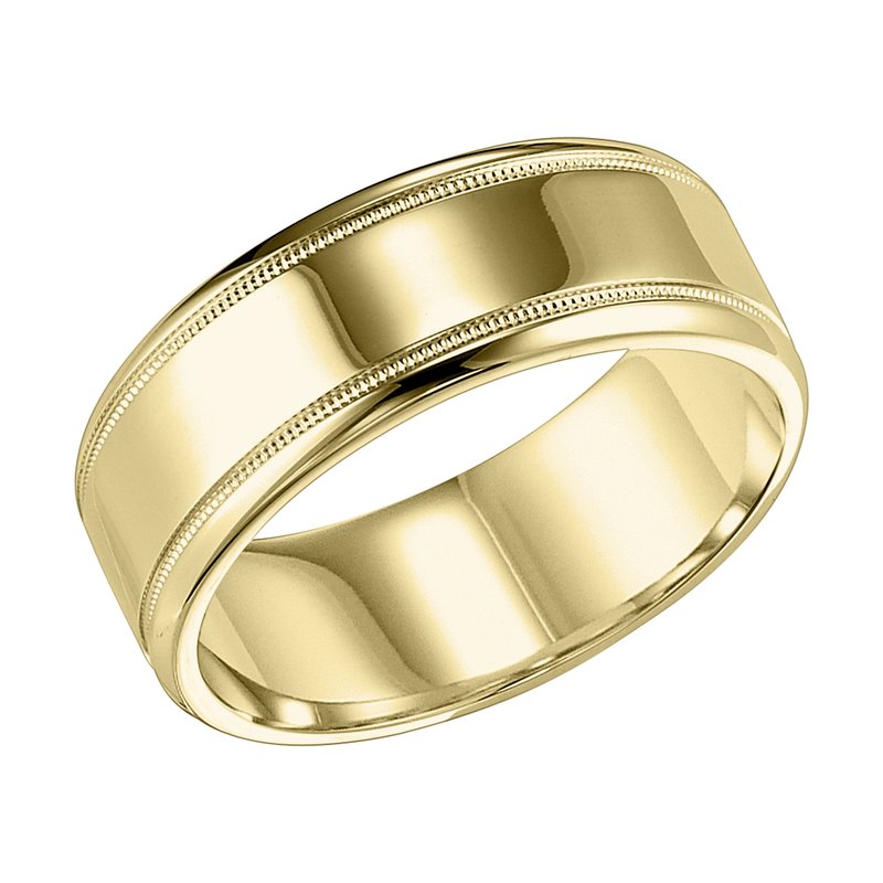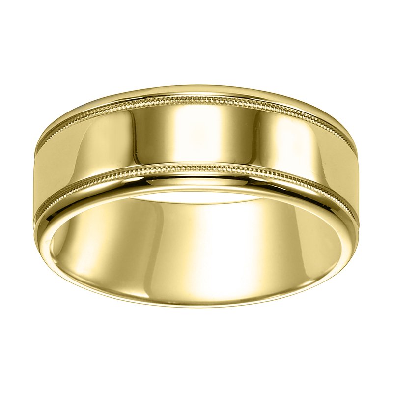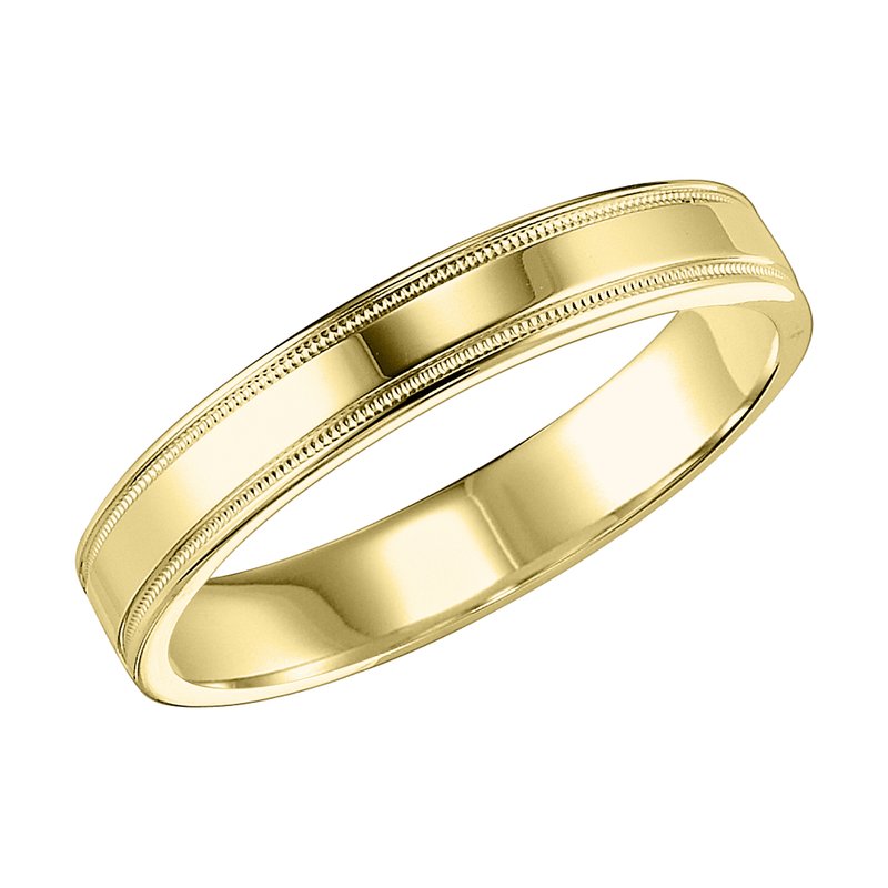 Comfort fit wedding band with bright finish, milgrain and round edges.