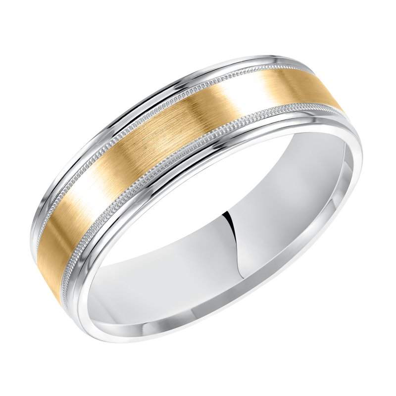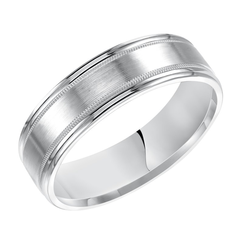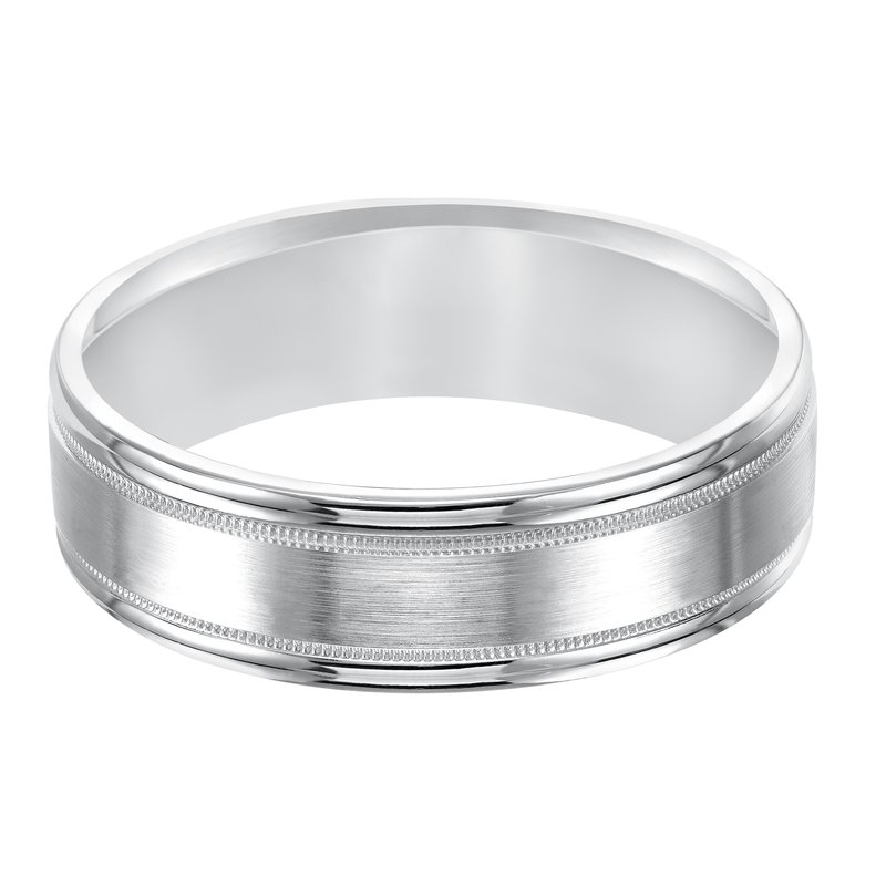 Comfort fit wedding band with satin finish, milgrain and flat edges.