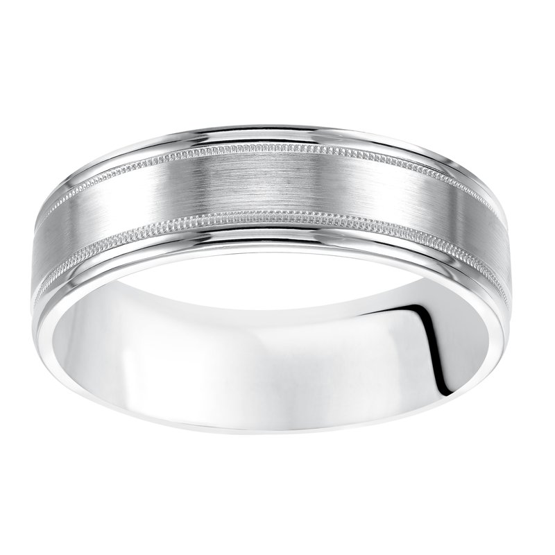 Comfort fit wedding band with satin finish, milgrain and flat edges.