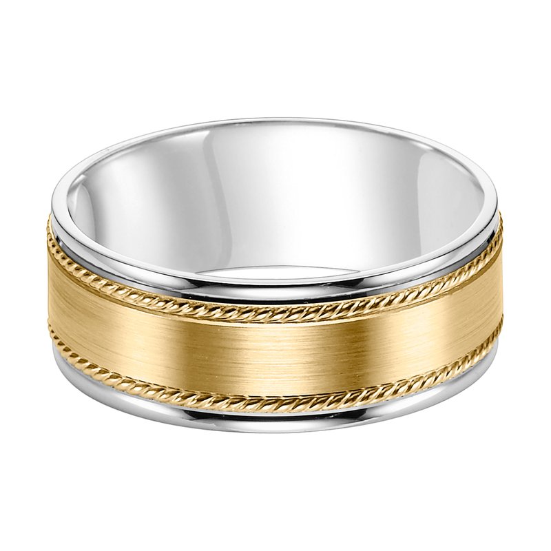 This handsome, Comfort Fit, wedding band features a delicate rope accent, flat satin finish and rounded edges to complete the look