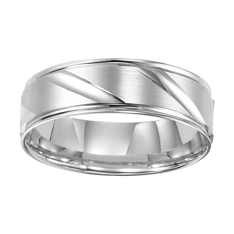 This Comfort Fit, wedding band features a flat, satin finish with modern, diagonal cuts and round edges for a unique look
