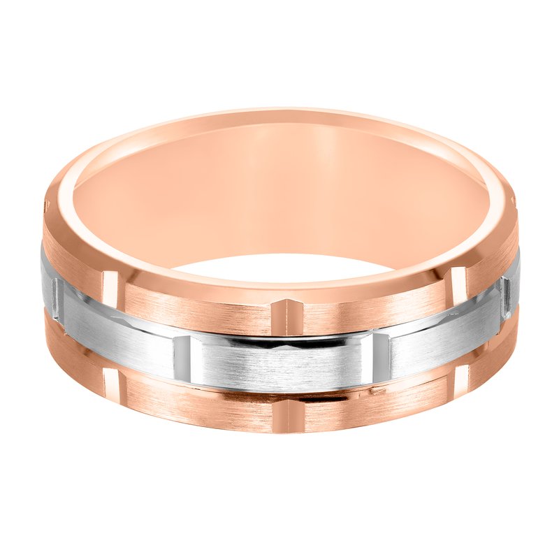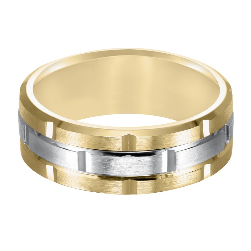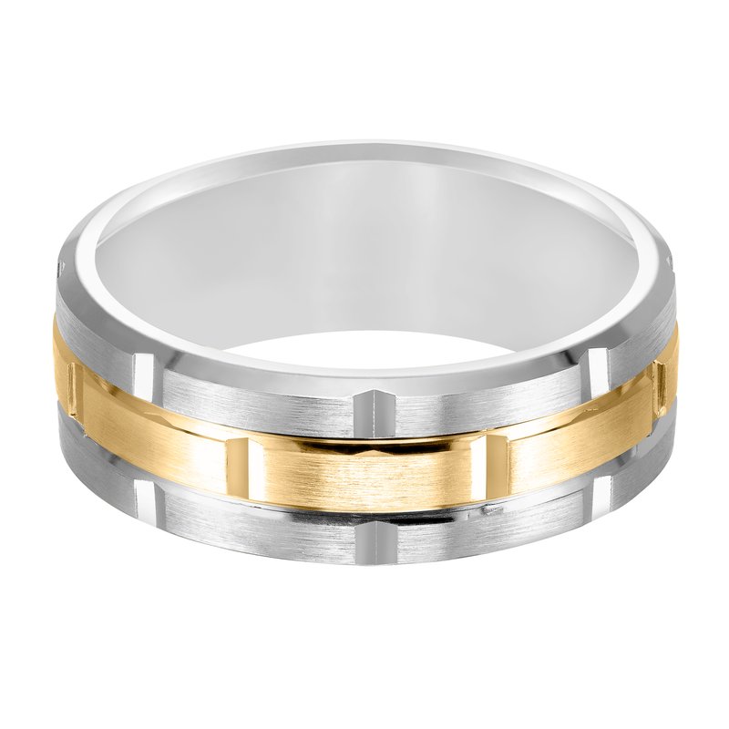 This innovative, matrix-inspired Comfort Fit, wedding band features a flat, satin finish with vertical cuts and a beveled edge