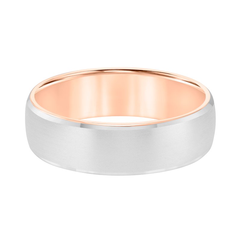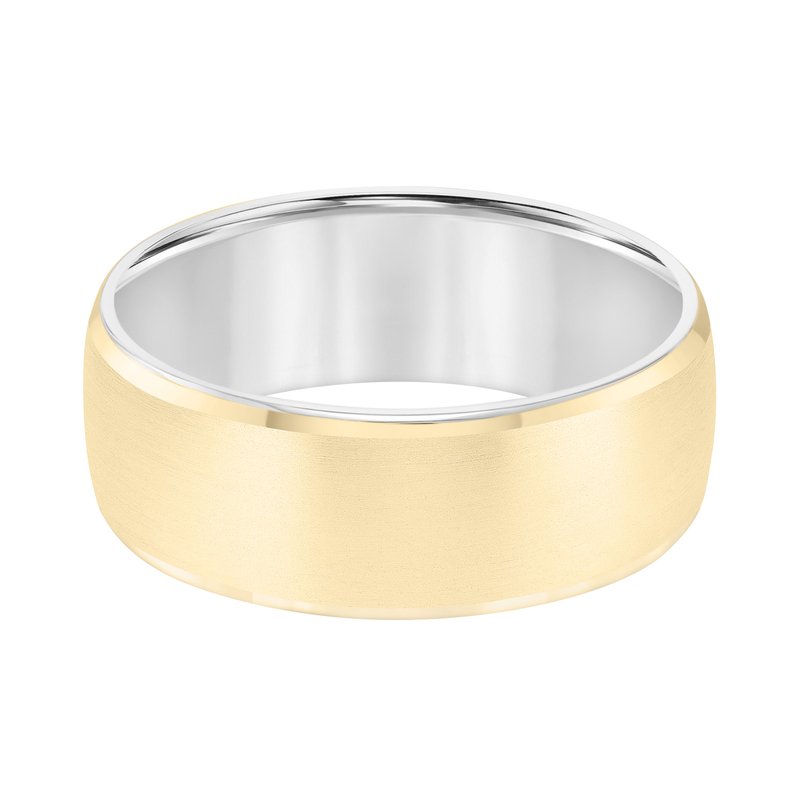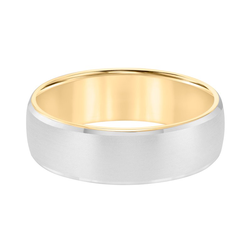 It is all in the details with this luxuriously designed two-tone gold, Comfort Fit wedding band featuring a satin finish with rolled edge
