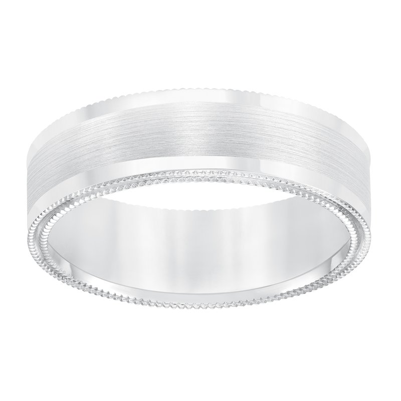 Men's wedding band with satin finish with flat edge, double milgrain side treatment and flat profile.