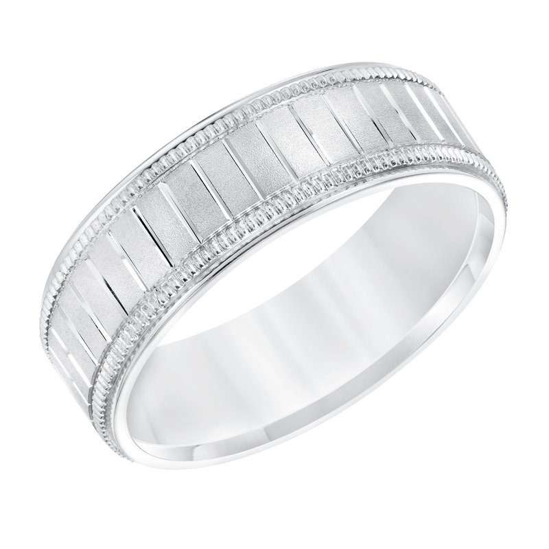 7MM Comfort Fit Wedding Band with Flat Profile, Horizontal Cuts and Milgrain Accent with Round Edges