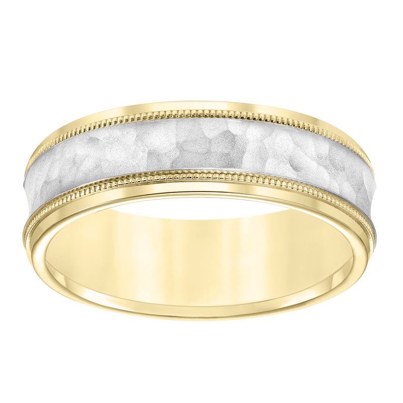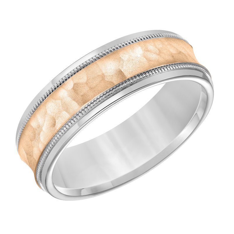 7MM Comfort Fit Wedding Band with Hammer Finish and Milgrain Accent with Flat Edges Please note hand hammered styles will have slight variations due to the nature of the manufacturing process