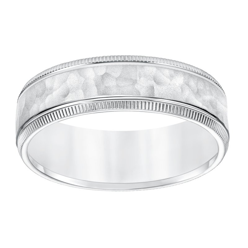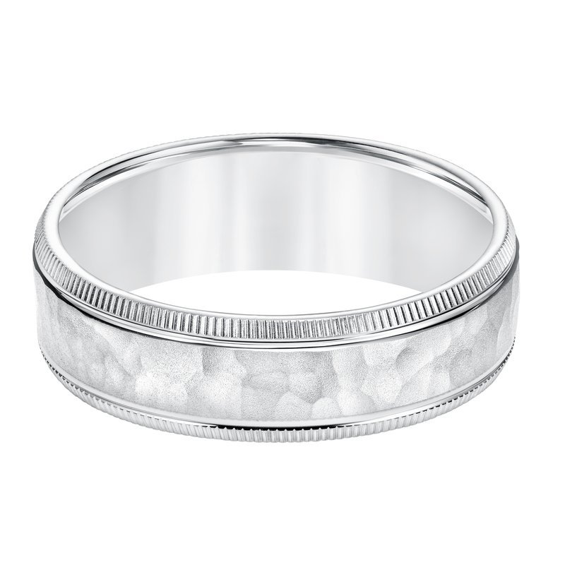65MM Comfort Fit Wedding Band with Hammer Brush Finish Spin Lines and Coin Edge Please note hand hammered styles will have slight variations due to the nature of the manufacturing process