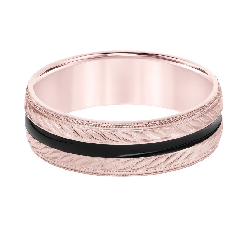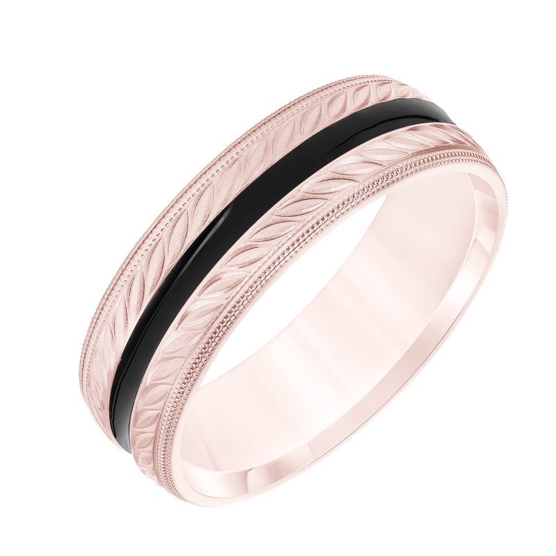 Mens Comfort Fit Wedding Band with Brush Finish and Wheat Motif and Black Epoxy Center Stripe