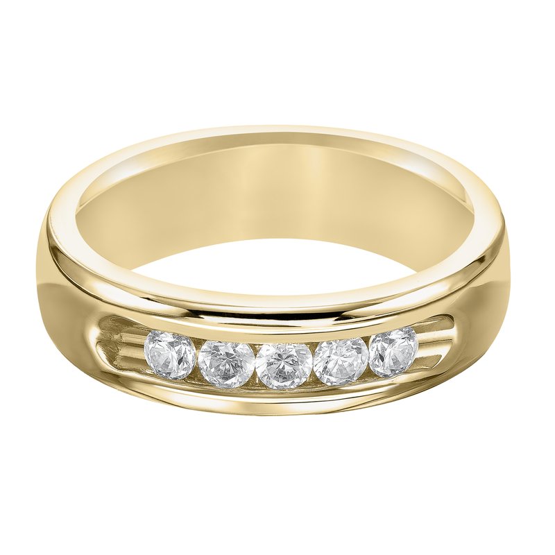 This 5 stone diamond, Comfort Fit, wedding band features a bright polished finish and flat edge for a classic look that is sure to make a statement
