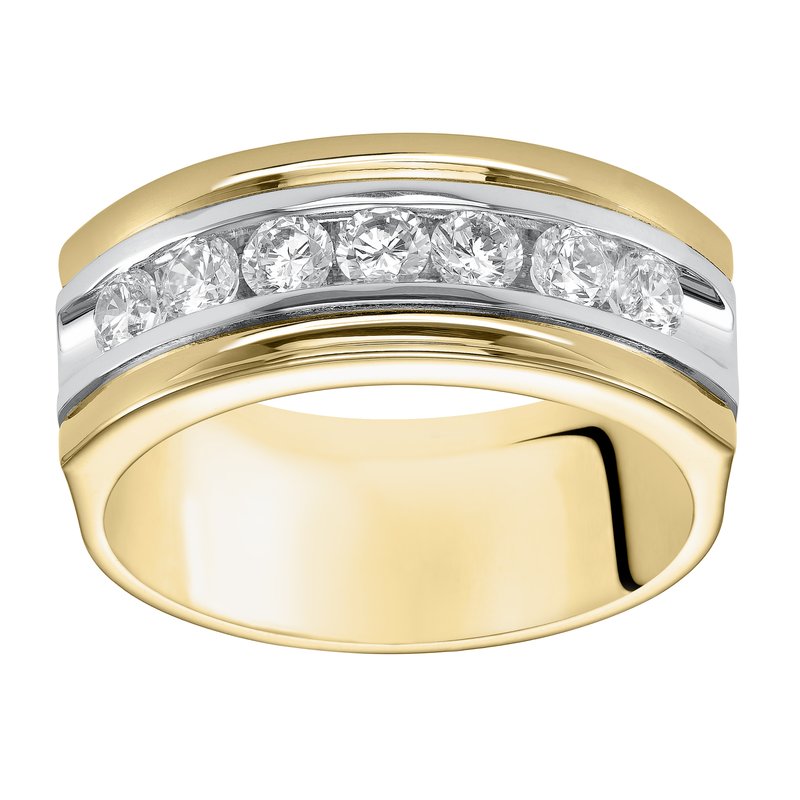 This 7 stone diamond, two-tone gold wedding band features a low-domed style, semi-square profile, bright polished finish and flat edges
