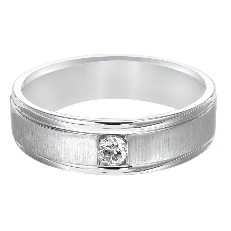 This handsome, single stone diamond wedding band features a flat, Comfort Fit design with satin finish and round edges